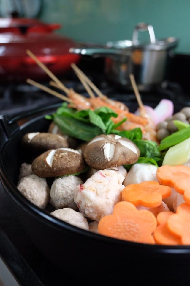 Put the stove at the center of the table. Fill the shabu-shabu