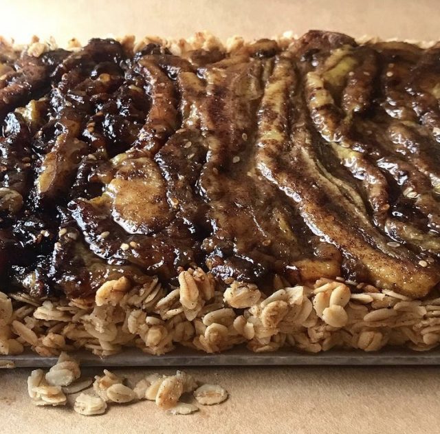 To showcase the humble banana, Selina Ocampo places it on a pedestal with the help of ingredients like dates, almonds, coconut oil and oats. She caramelizes the bananas then lays them on a bed of date toffee jam cemented on an oatmeal pie crust. Pastry cream can be added for a layer of creaminess. Best banana dessert ever!