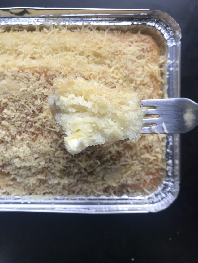 Get a hint from the name. It’s not your traditional banana leaf-lined, salted egg-topped rice cake. It’s a modern take on the Christmas staple. A fudgy and moist butter cake is dotted and crowned with three types of cheeses.