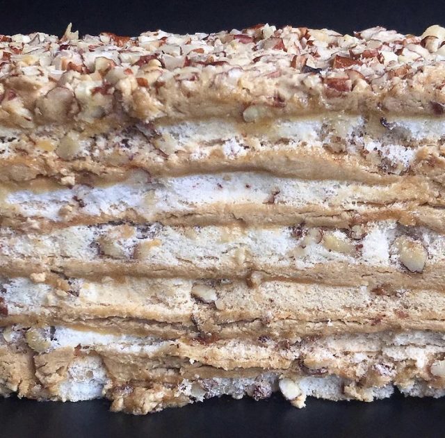 It was a pastry born out of the request of a customer who loves pecans, says baker Angela Viloria. “She loves our Opera cake buttercream and wondered if we could do a sans rival with it.” The result is a nuttier-tasting layered meringue cake, studded with chopped pecans. It also comes in coffee flavor.
