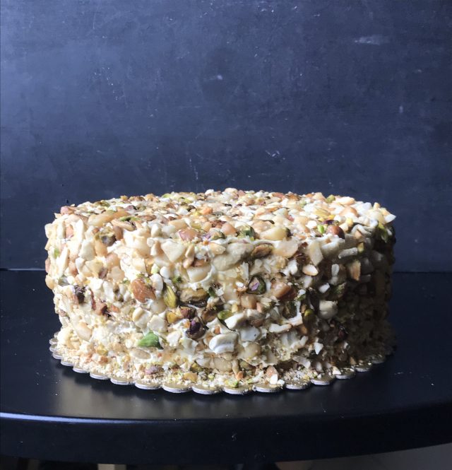 Couple Kris and Cholo Mendoza roast their own nuts for personal consumption. One time, while snacking on them, they came upon the idea of doing their 50-year-old sans rival recipe using pistachios, macadamias and cashew. They put the nuts not just outside the cake, but inside too, with 70 percent more in the meringue for optimal crunch and flavor.