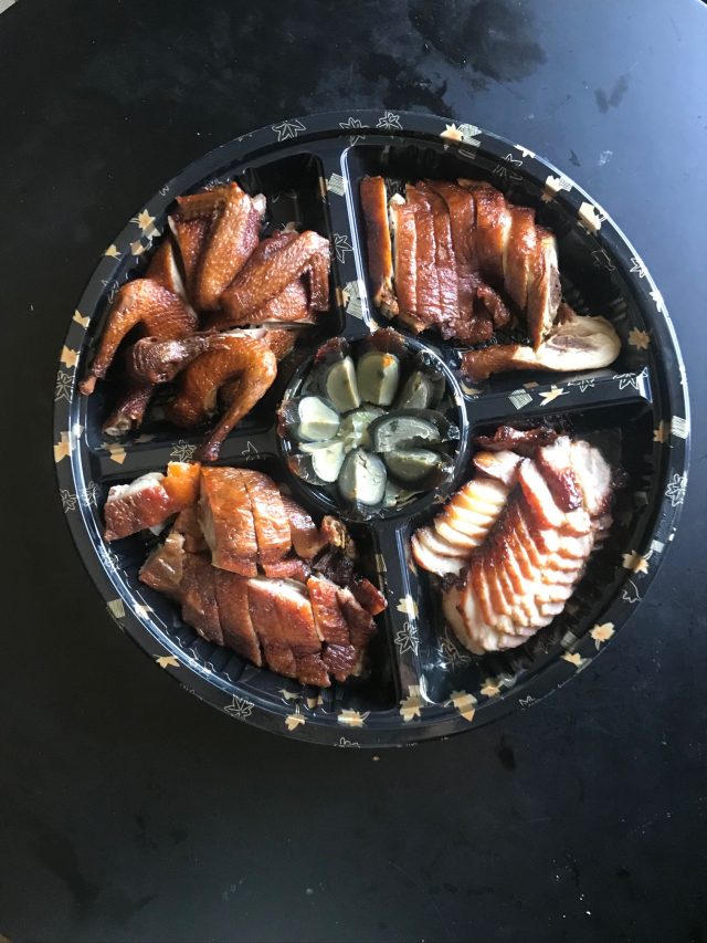 This abundance platter has different kinds of Chinese roasts and condiments. There’s jellyfish and century eggs for wealth, toro char siu for strength, and soy chicken for good luck. It also has fried pigeon, a quarter Peking-style roast duck and, to add more layers of flavor, hoisin, honey glaze, plum sauce, gravy, ginger scallion and fermented chilies.