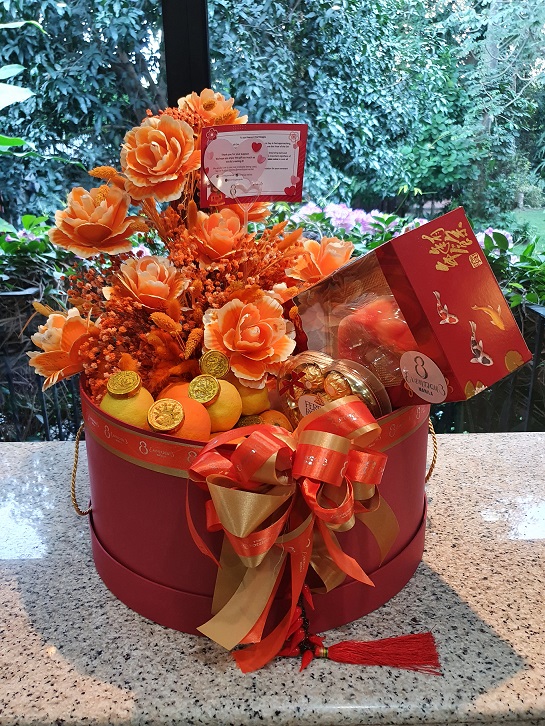 Their Chinese Valentine arrangement is a red hat box filled with gold coins, chocolate hearts, fish-shaped tikoy, fruits and flowers big and small in orange hues. Each and every element that went into it was so well-thought-out, even the lemons. For after all, ain’t love and life a blend of sweet and sour?