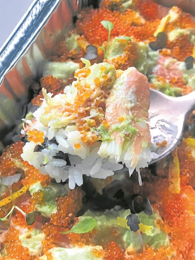 Choomp Choomp uses good quality seafood ingredients flown in from Japan monthly. Its sushi tray is not heavily laden with sauce and baked. This one is eaten chilled or at room temperature. There’s lobster ikura, and the latest variant, snow crab with avocados on sushi rice. (Choomp Choomp, tel. 0920-9218870)