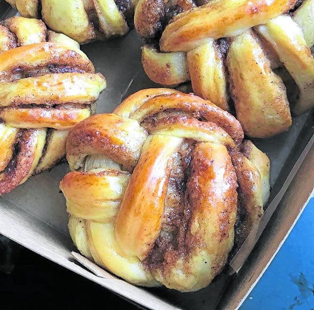 Apart from banana loaf and ube pan de sal, the cinnamon bun has also been trending lately. One that stands out for both its presentation and taste is that of Falzores Patisserie. Chef Timothy Faller’s version is braided instead of swirled, and the cream cheese frosting is stuffed inside and not slathered on top. The buns are glazed with maple syrup for a nice sheen. (Follow